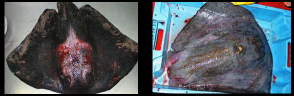 Tamaño: 190cm de largo y hasta 80cm de ancho Estado de conservación: Considerada CERCA DE ESTAR AMENAZADA en el Mediterráneo (IUCN). Importancia pesquera: Ejemplares capturados de forma accidental por redes a la deriva o palangre. Especie descartada debido a su bajo o nulo valor comercial. |